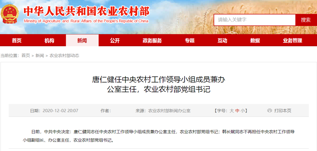 日前,中共中央决定:唐仁健同志任中央农村工作领导小组成员兼办公室主任,农业农村部党组书记;韩长赋同志不再担任中央农村工作领导小组副组长、办公室主任,农业农村部党组书记。