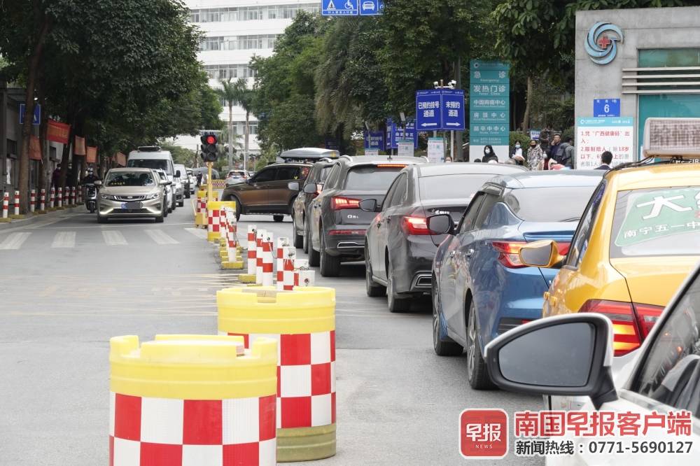 ▲一些医院因停车位紧张,导致医院入口车辆排成长队。图为记者在广西医科大学第一附属医院门口拍到的场景。南国早报客户端记者苏华/摄