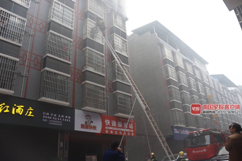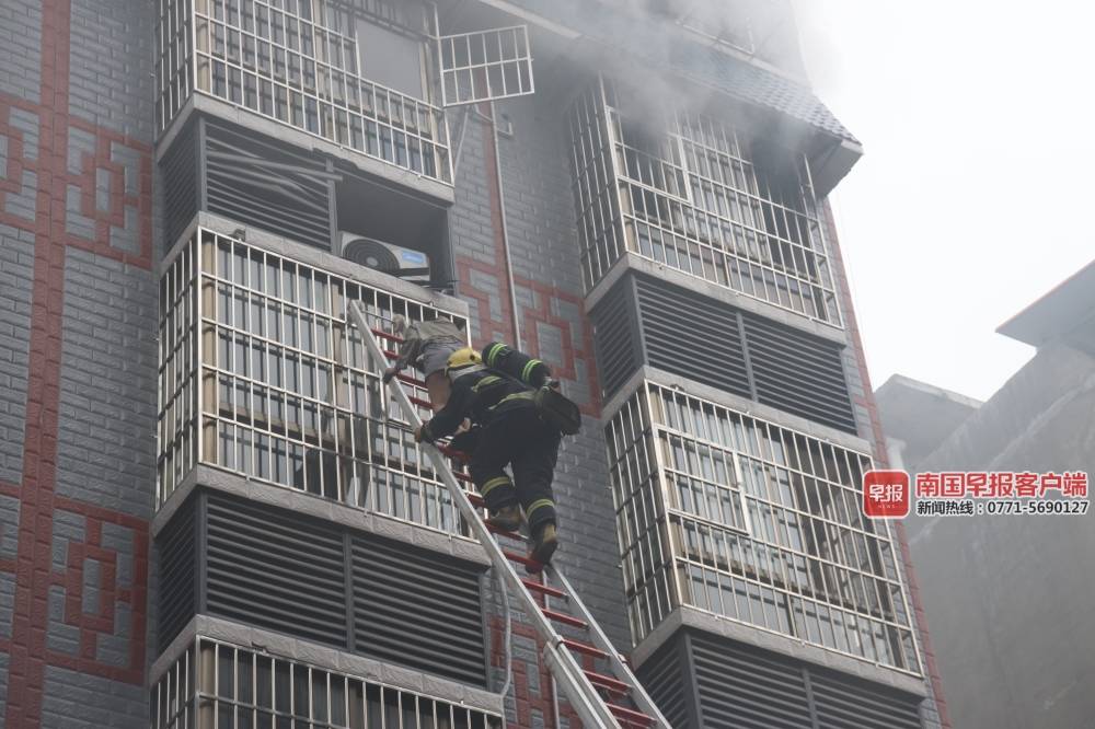河池一民房高层起火 被困3人爬到防盗网外被熏黑