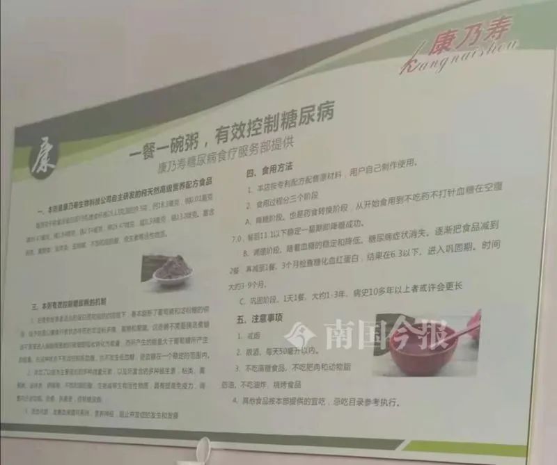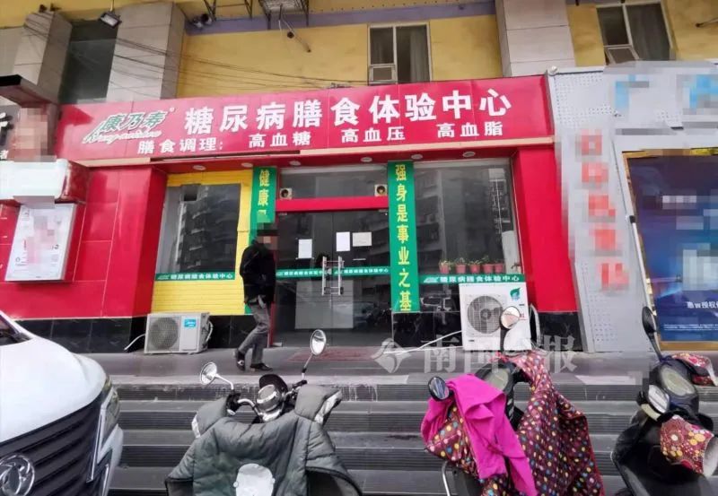 门面关了,手机停了 12月6日,记者来到老人投诉的膳食中心,玻璃门用一把大锁锁着。透过玻璃门可以看见,里面放有桌椅板凳,墙上贴着宣传海报“一餐一碗粥,有效控制糖尿病”。海报显示,这种粥是康乃寿生物科技公司自主研发的纯天然高级营养配方食品,能抗癌、抗衰老、控制糖尿病。