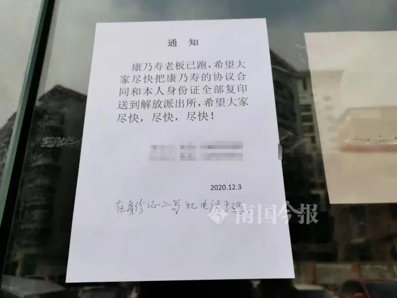 门上贴有一张通知,写着康乃寿老板已经跑路,希望大家尽量快把和合同、身份证复印,到解放派出所报案,落款日期是12月3日。