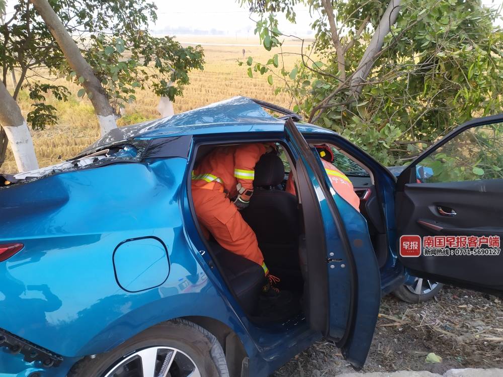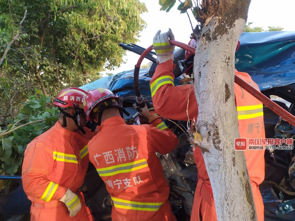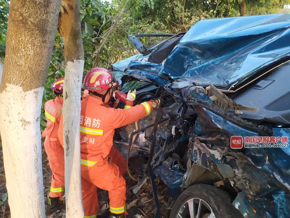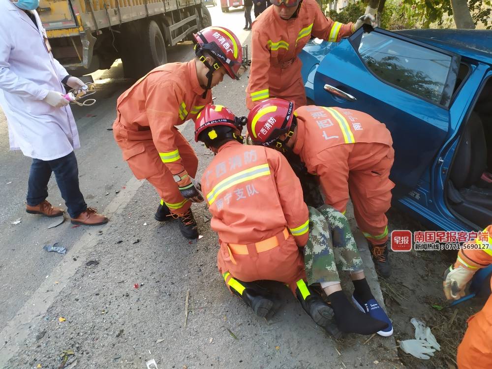 当天上午,宾阳县消防救援大队接警后,调派2辆消防车、12名消防员前往现场展开救援。消防员到达现场后发现,小轿车驾驶员被困在驾驶室无法移动。