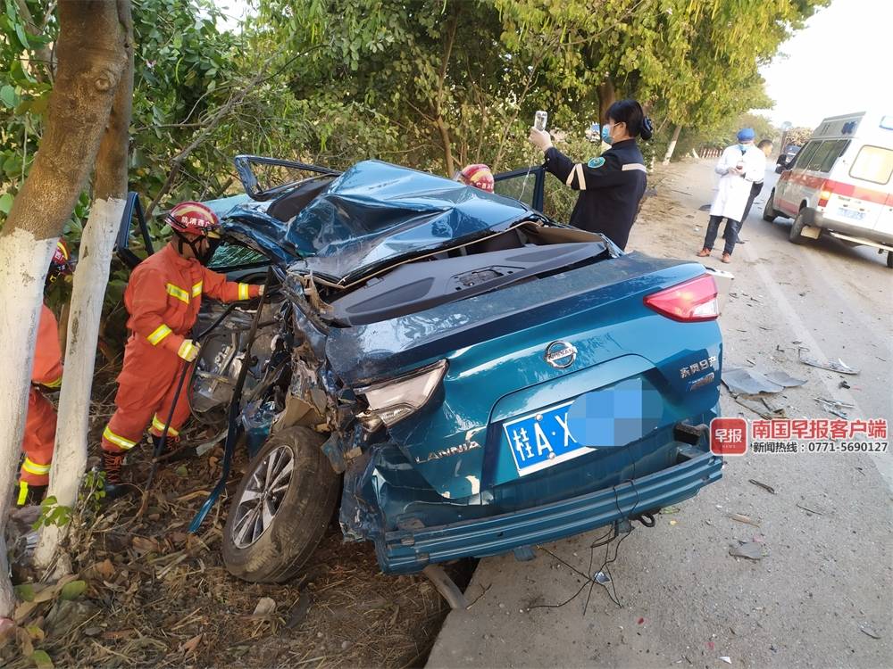 12月6日上午7时18分,在南宁市宾阳县二级路六合村路段,一辆小轿车与大货车相撞,导致小轿车受损严重,驾驶员被困车中。事发后,消防、急救等部门人员到场处理。