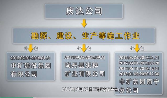 庆达公司在经营大坪旷过程中,将勘探、建设、生产等施工作业采取外包形式承包给其他公司,2019年9月22日至事故发生前,大坪旷的承包单位为南丹县洪锌矿业有限公司和中矿集团有限公司南宁分公司。