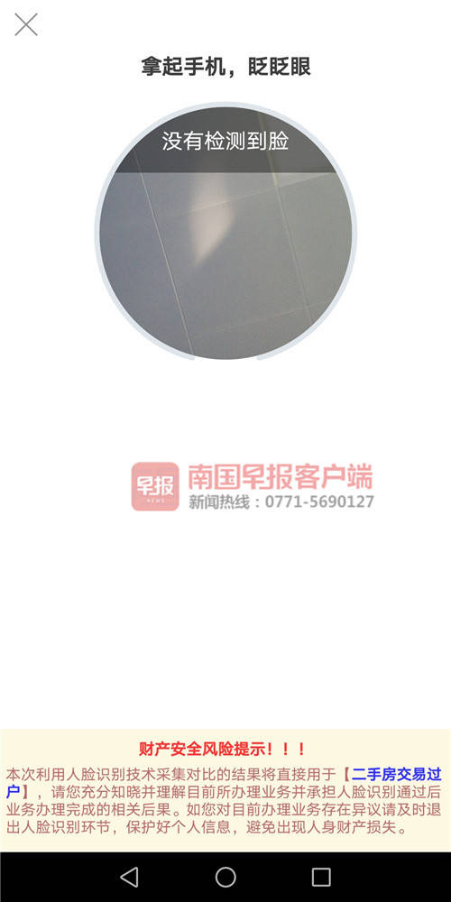 若登录者尝试交易不属于自己的房产,将被系统直接拒绝。校验通过后,随即进入首次“刷脸”认证环节。“刷脸”页面下方插入了醒目的“财产安全风险提示”,并用加粗红色字体提醒办理者,当前正在办理的是二手房交易过户业务。
