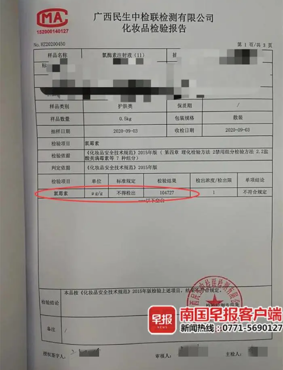 经南宁市质量监督局抽样送检,发现其中两款产品汞含量分别超标961倍和1925倍;3款产品氯霉素分别超标77366倍、104727倍和74029倍。