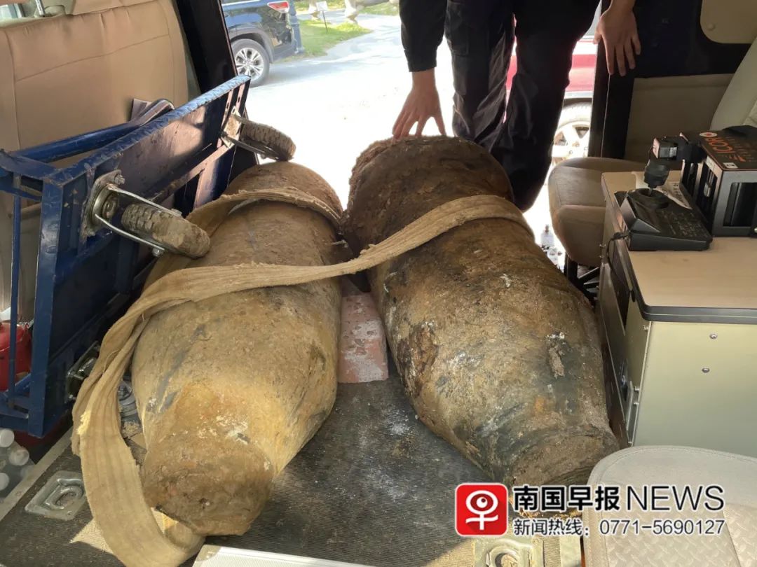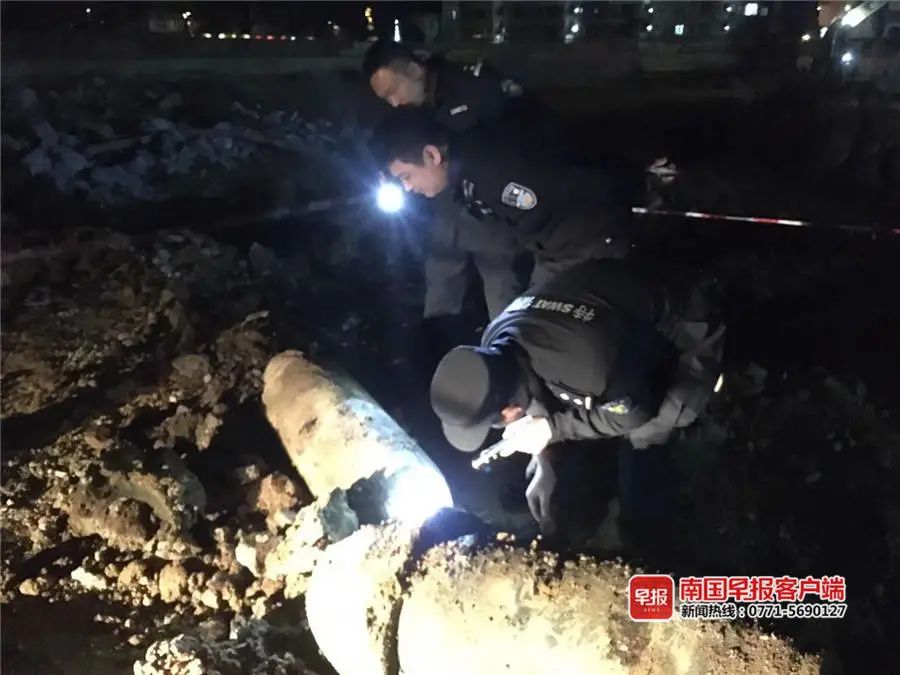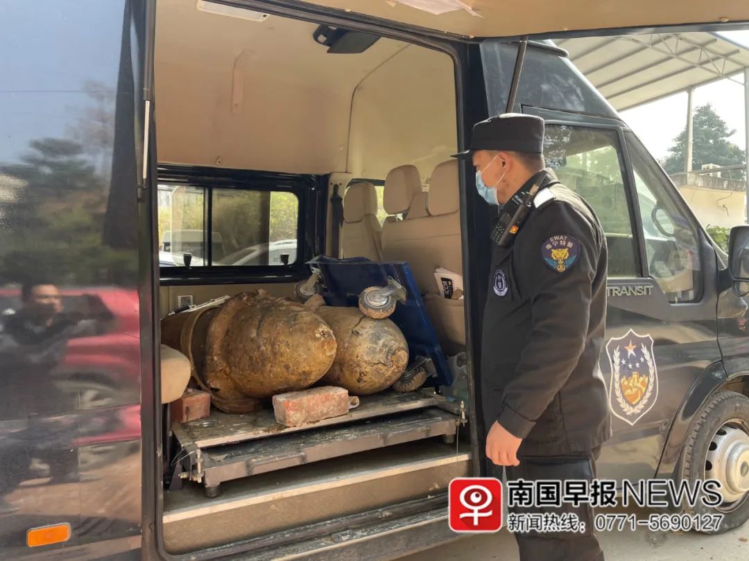 施工人员在保护好现场的同时,迅速报告警方。没多久,南宁市公安局特警支队七大队赶到现场,将两枚炸弹运走。