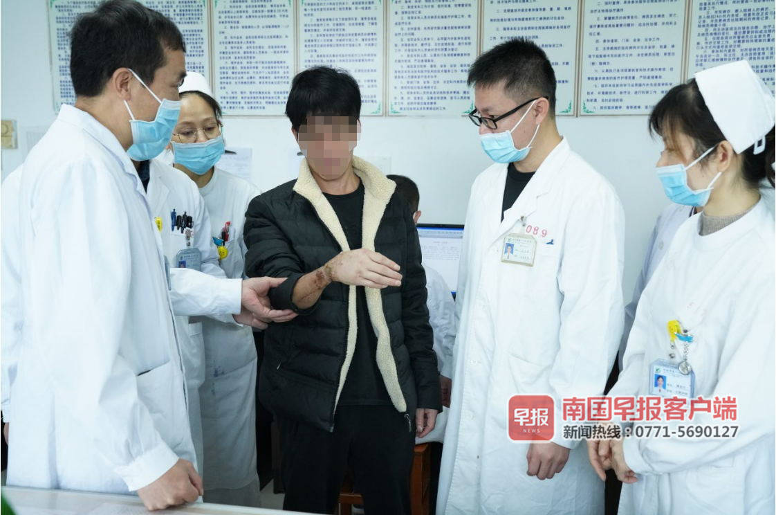 “翻车后起身,我发现我的右手不见了,找了一圈才找到,捡起来我就立马来医院就医了。”12月9日,河池市第一人民医院内,一名患者面带微笑向旁人说起他的经历。