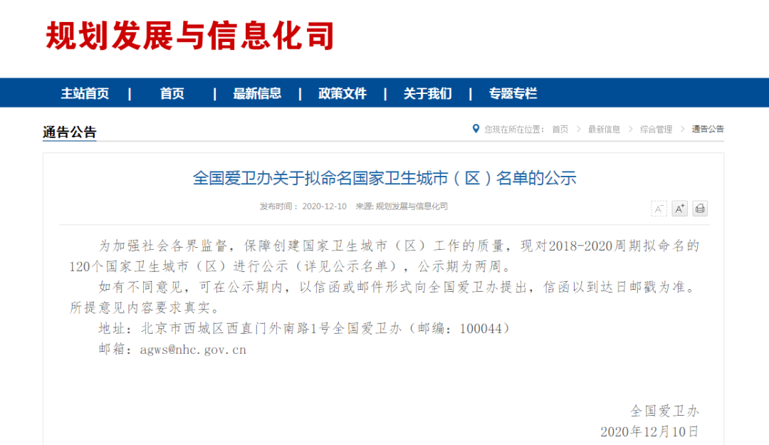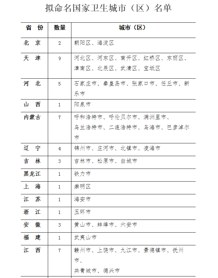 为加强社会各界监督,保障创建国家卫生城市(区)工作的质量,现对2018-2020周期拟命名的120个国家卫生城市(区)进行公示(详见公示名单),公示期为两周。