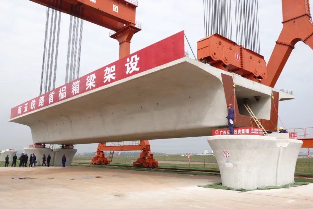 广西首条自主投资建设时速350公里高速铁路南玉铁路又有新进展。12日上午,在南玉铁路项目六景制梁场,随着架桥机将重达800余吨的箱梁平稳、精准地落到学冲村特大桥桥墩上,南玉铁路项目首榀箱梁架设成功,创造了广西铁路建设“当年开工、当年架梁”的纪录。记者了解到,南玉铁路预计2023年建成通车,沿线共设6座车站。
