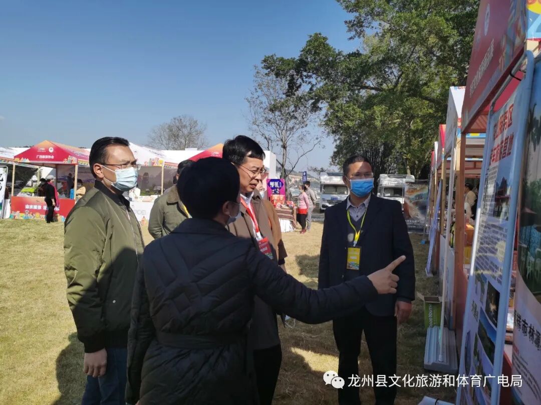 崇左市副市长蒋红林(右二)参观龙州展位,崇左市文化和旅游局局长张雪奎(右三)介绍龙州旅游资源