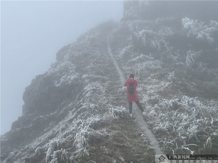 广西新闻网南宁12月15日讯(记者 黄诗淇 麦一帆 实习生 覃金蓉)12月15日,强冷空气如期而至,南宁的冬天也有了披上“白色外套”的地方。大明山景区出现了冰凌雾凇景观,前往景区观赏冰凌雾凇景观的游客量不断增长。随着气温的降低,路面也出现结冰现象,为保障游客安全,景区提出了相关注意事项及购票指南。