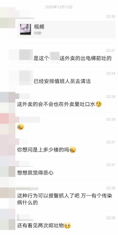 随后,姚女士拍照向物业反映问题,物业立即派保洁员对现场进行清洗消毒并查看电梯监控,经排查发现,吐口水的竟是一名外卖员。