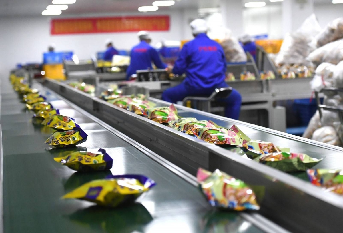 ▲柳州螺蛳粉产业园里,工人在袋装螺蛳粉生产车间里忙碌。