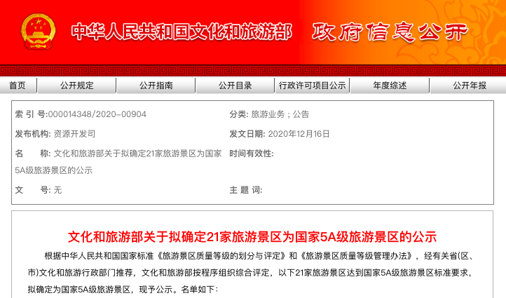 21家5A级旅游景区名单