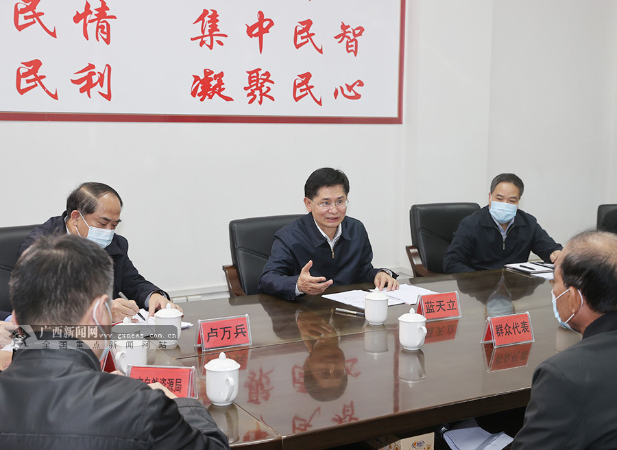 当天,蓝天立还来到南宁市群众来访接待中心。在信访接待室,蓝天立接待了来自江南区沙井街道邕津村一组村民代表黄华兴、孔祥和,认真倾听他们反映的希望加快审批手续、对违规建设的三产回建项目依法处置、拆除、整改的诉求和意见,耐心解释有关政策和法规,与自治区相关部门和南宁市政府负责同志共同商议解决办法,要求南宁市加快完善征地拆迁安置配套措施,依法依规加大对违规建设三产回建项目的处置和整改力度;住建部门要做好项目审批指导服务,尽快完成邕津村三产回建项目的审批工作。