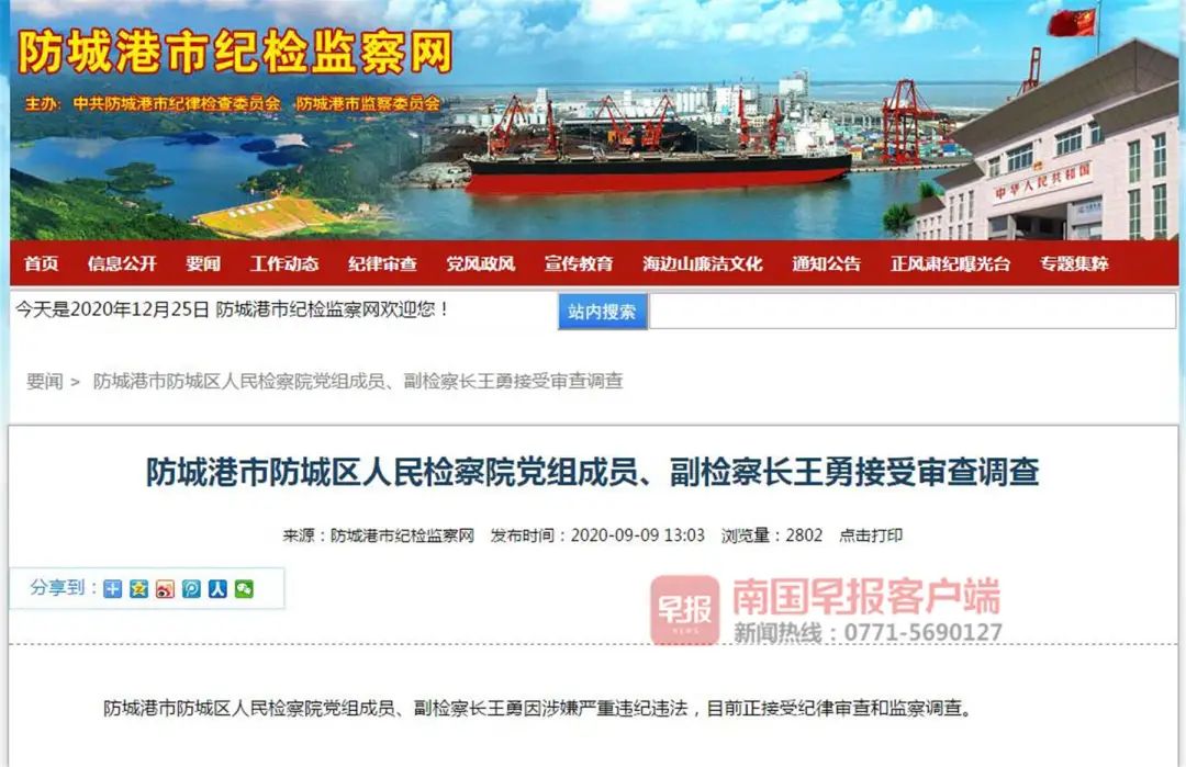 12月25日,防城港市纪委监委发布消息,日前,防城港市纪委监委对防城区人民检察院原党组成员、副检察长王勇涉嫌严重违纪违法问题进行纪律审查和监察调查,并对其采取留置措施。