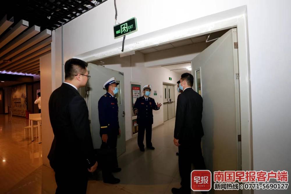 ▲检查组对安全出口、疏散通道是否畅通进行检查。南宁消防供图