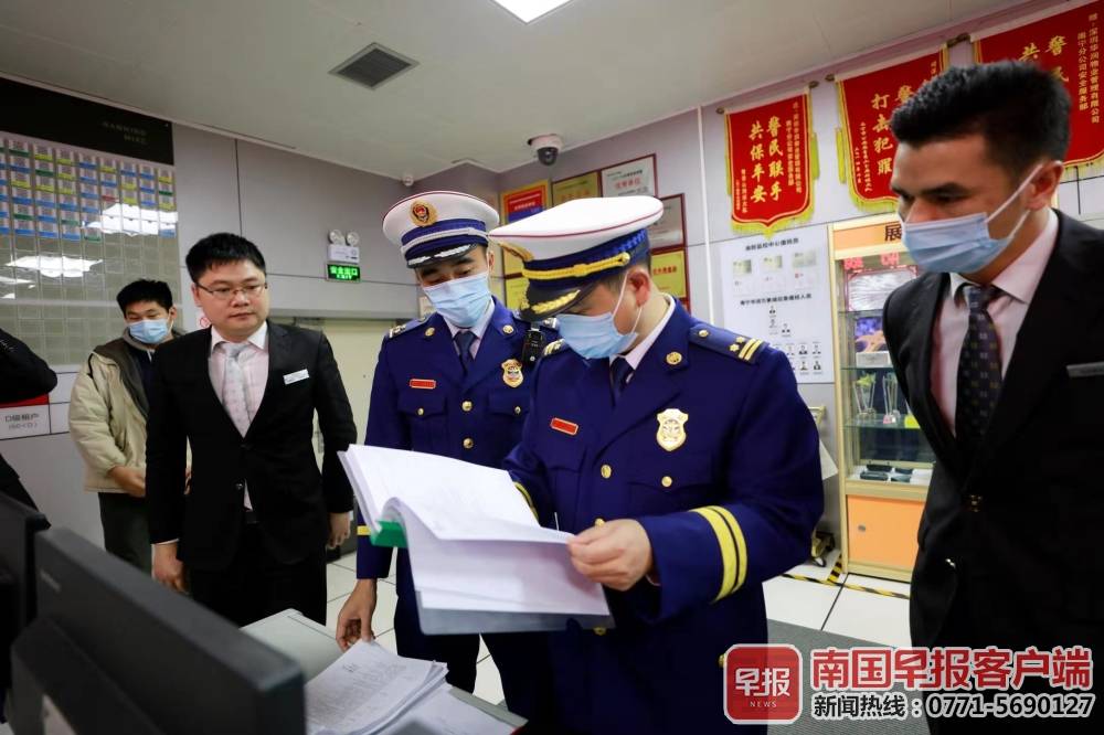 ▲检查组工作人员对一夜间营业场所的工作人员进行询问。南宁消防供图