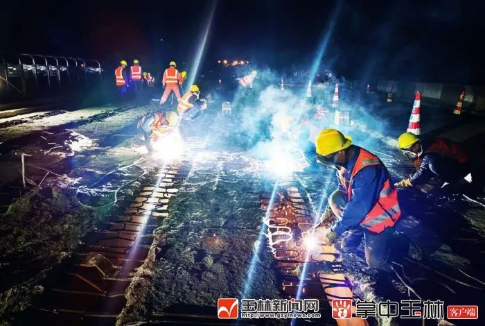 20时15分,记者在工程人员引导下,由兴业收费站进入正在施工建设的“玉林往南宁方向”半幅路面。此时天已漆黑,寒意更浓,然而这个10天前还密集通车的路面已经完全变成一个热火朝天的工地:各个工程队挑灯夜战,工人们在焊钢筋、清理路侧、拆旧钢护栏,额头挂满汗珠;风镐机、工程车、浇注机等各类机械轰鸣声响彻云天……