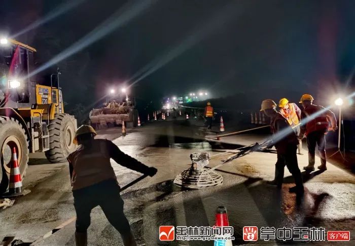 △12月24日晚,兴六高速“玉林往南宁方向”半幅改造现场热火朝天。