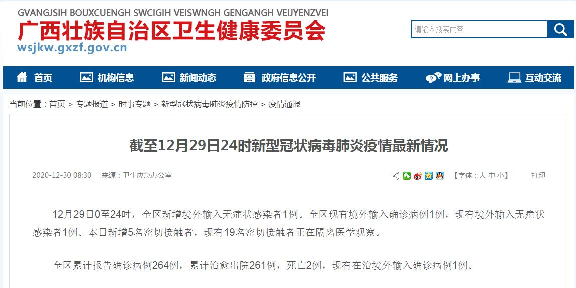 12月29日0至24时,全区新增境外输入无症状感染者1例。全区现有境外输入确诊病例1例,现有境外输入无症状感染者1例。本日新增5名密切接触者,现有19名密切接触者正在隔离医学观察。