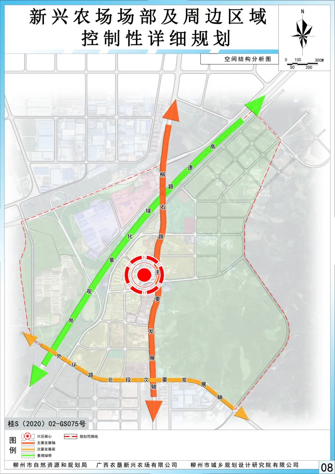 规划形成“一心、一带、两轴”的结构体系。“一心”指以广西农垦新兴农场有限公司及周边公共服务设施为依托形成的片区行政及公共服务中心。“一带”即以高速路两侧绿化景观带为依托,重点打造片区绿化景观风貌。“两轴”指以柳石路延长线为主要发展轴,及以外环路北段为基础的次要发展轴,带动沿路用地发展。