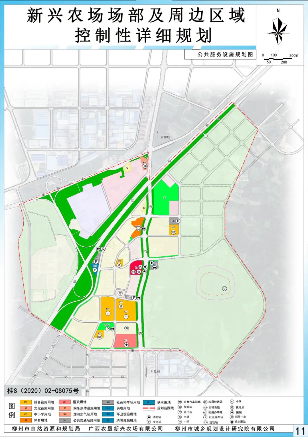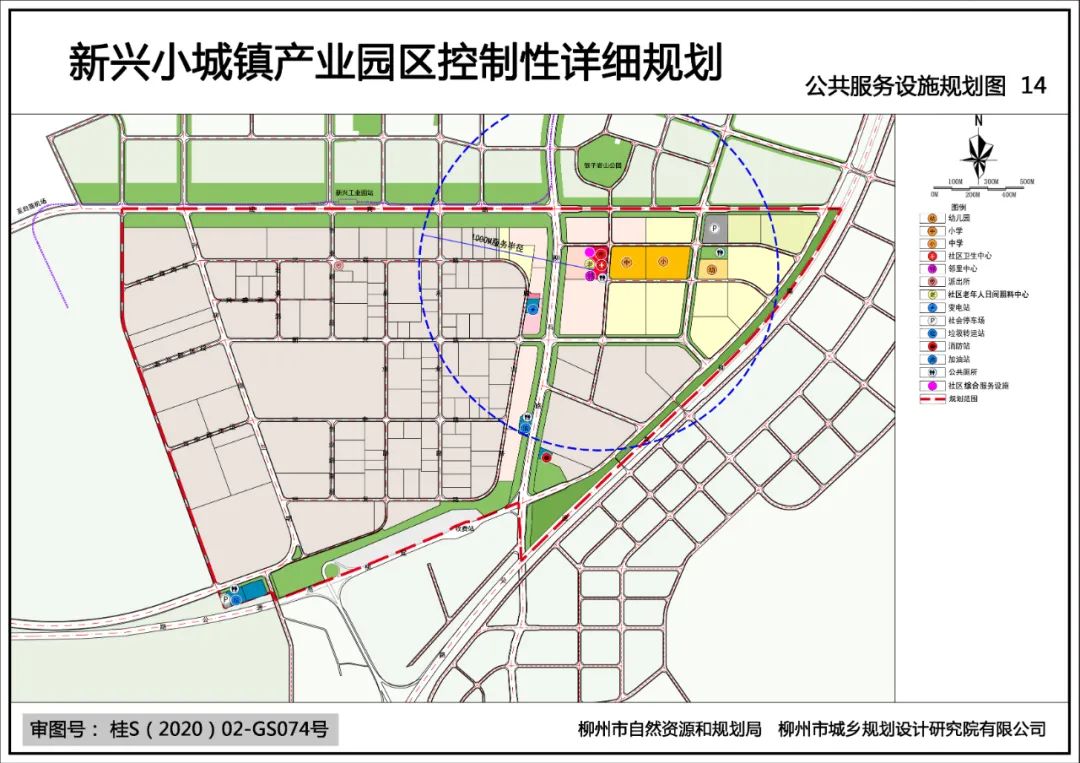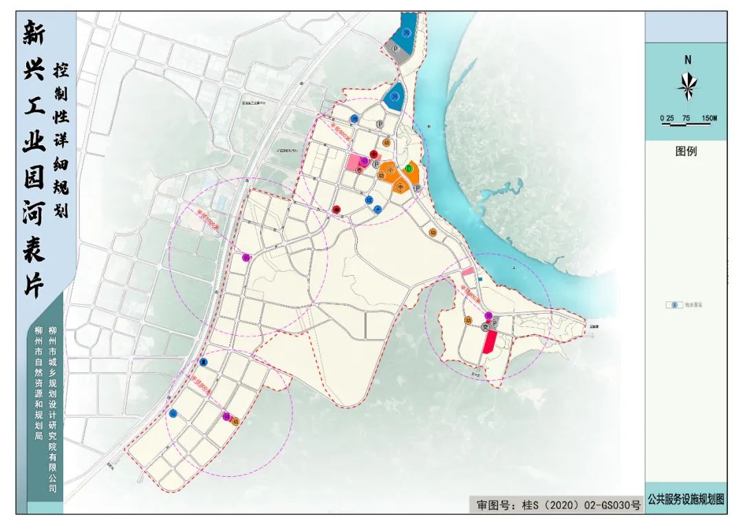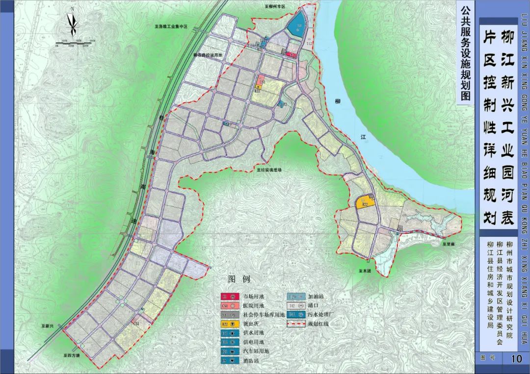 规划110KV变电站1座、公交车场1座;扩建原有中学、小学;保留原有新兴高速公路收费站、广西桂中公路管理局柳州新兴超限监测站、桂柳高速交警高速公路大队、加油站1座;以15分钟社区生活圈作为规划建设的基本单元,规划配建1个居住级邻里中心。