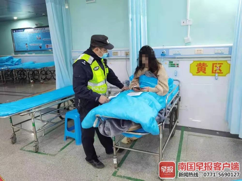当天凌晨3时许,南宁市公安局武鸣分局接到警情,在武鸣区城中村濑琶村一出租房内,一名年约20岁的女子割腕自杀,请求民警帮助。辖区灵水标营派出所民警立即出警,迅速找到女子的住处。