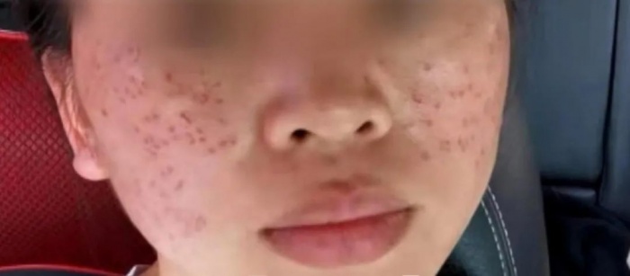 两个月前,柳州的冯女士在胜利商贸城一家美容店进行脸部保养后,却变成了“大花脸”。冯女士说,当时美容店的老板说她脸上有点小斑点,可以帮她简单处理一下, 只要在脸上的表皮轻轻弄一下,三四天就可以恢复了,冯女士相信了,于是又花了260元做了祛斑,没想到做了之后自己整个脸部受到严重损伤,不但满脸红点,还伴有灼伤感。图为冯女士变成了“大花脸”。(法治最前线)