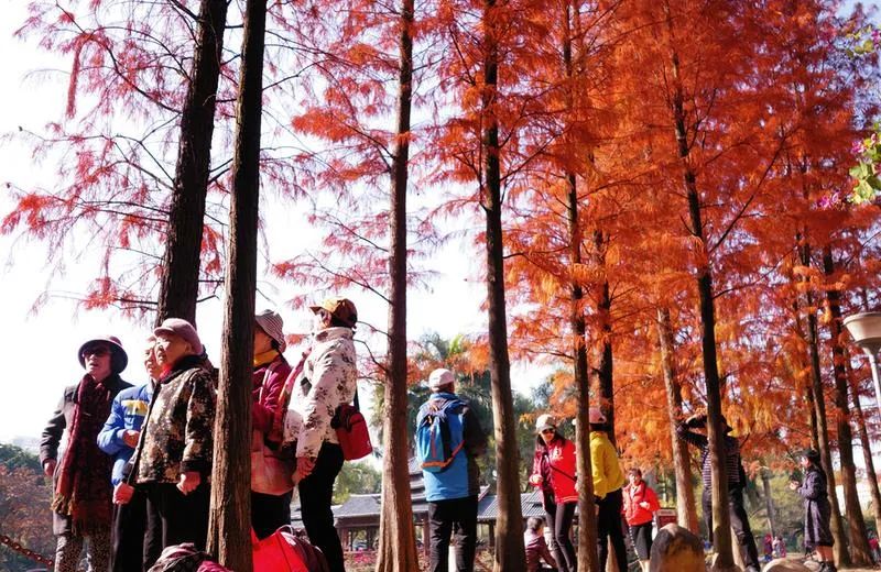 金花茶公园的池杉吸引游客。记者 梁枫 摄