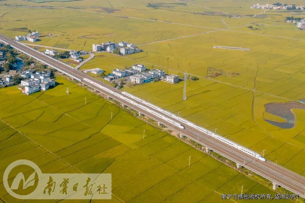 高铁动车在宾阳古辣美丽的稻田中穿行。记者 黄维业 摄