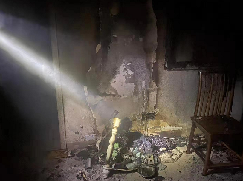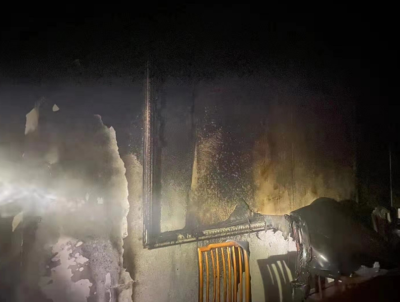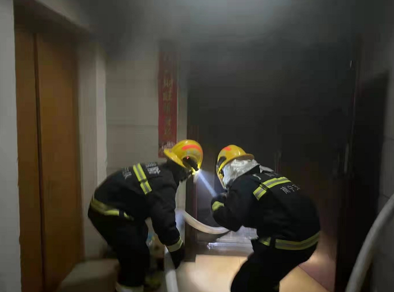 指战员到场后发现,一名男子在客厅用灭火器灭火。经侦查,发现起火点不大,火势变弱,指战员先让该男子退回阳台避开浓烟待逃生,随后利用室内消火栓成功灭了火,现场无人员伤亡。