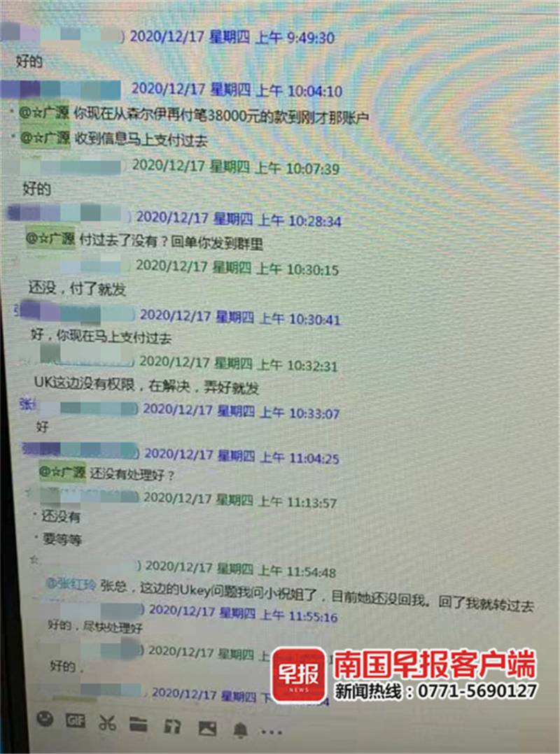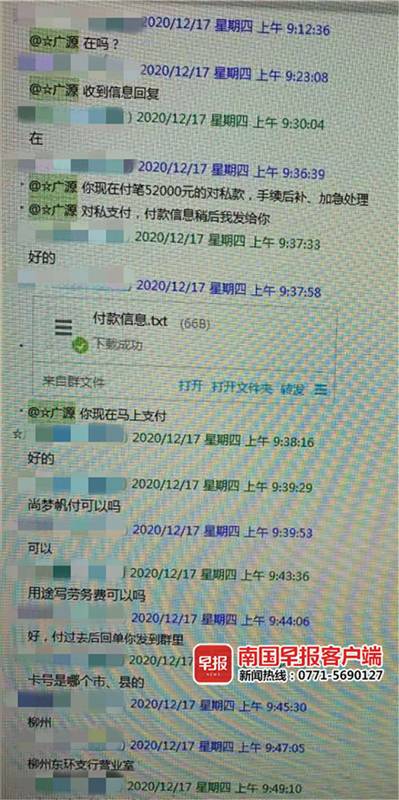 2020年12月17日上午,南宁市高新开发区某公司的财务罗女士接到一个电话,自称要为该公司的银行账户进行年审,并成功添加了罗女士使用的公司QQ,又通过QQ发送相关资料进行“年审”。随后,对方又将罗女士拉入一个有该公司高层的群,这些高层的头像和昵称都和现实一致。紧接着,群里的“公司老板”在群里过问公司银行账户年检的进程,并要求罗女士将公司账户余额截图并转款5.2万元至“客户”账户,罗女士对此一一照做。