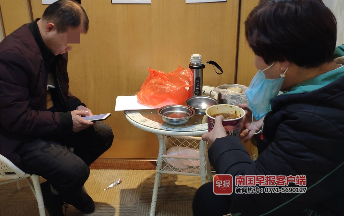 ▲一外地租客夫妇付了租金却没房可住,吃着泡面在公司等说法。南国早报记者何定坚摄