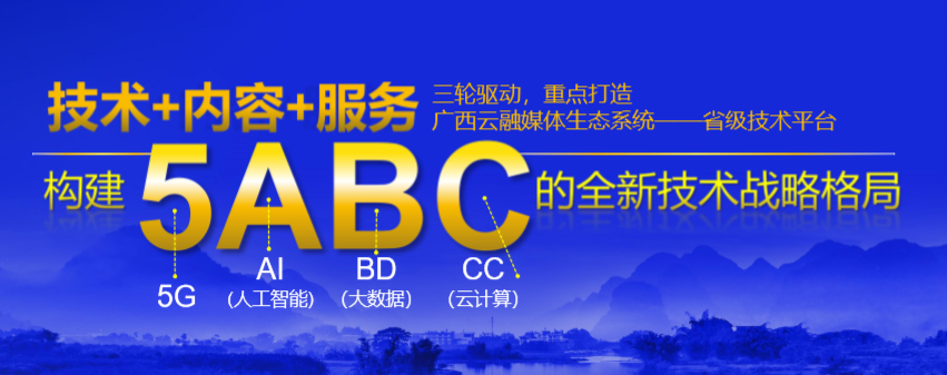 广西云融媒体平台以互联网智能生产力驱动数字传媒发展,实施“数智融媒+生态系统”的战略目标,以智媒中台为核心,构建“5ABC”即5G、AI(人工智能)、BD(大数据)、CC(云计算)的全新技术战略格局。广西云2.0版本现已进入运行阶段,由融媒生产向智媒生产发展,全面向智能化、移动化、数据化发展。