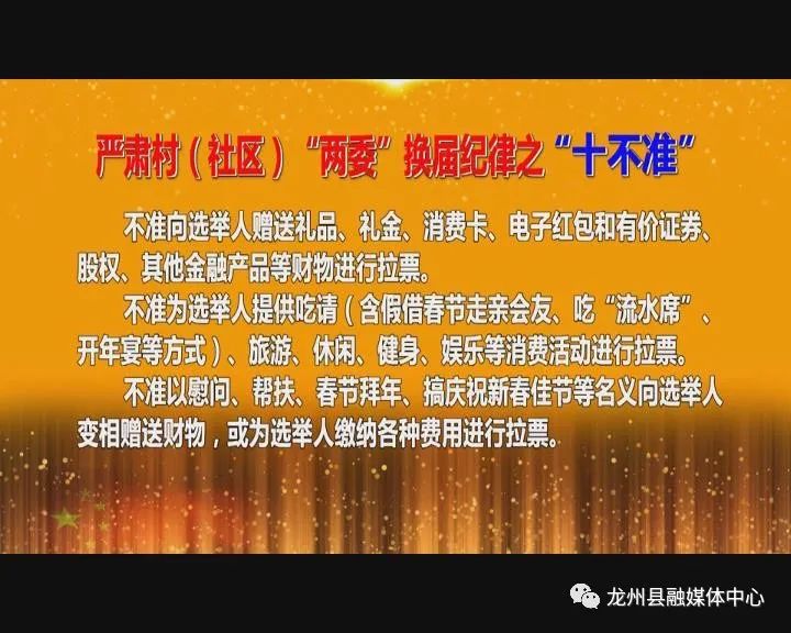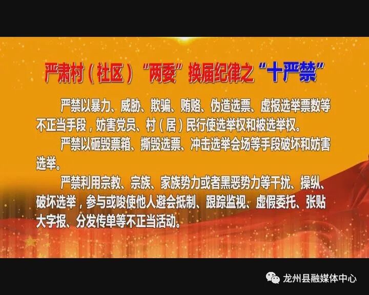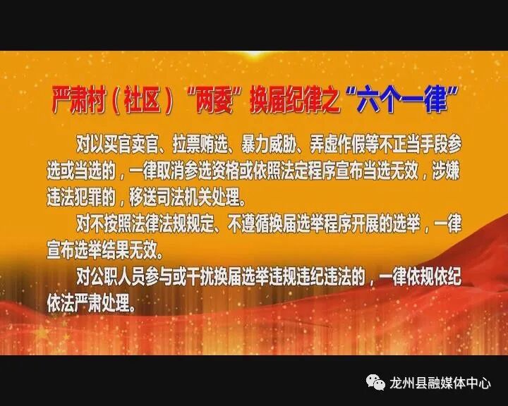 收看“全覆盖”,推动换届纪律进村入户。该县强化换届纪律宣传教育,在新时代讲习电视夜节目中开设换届政策解读专栏,将严肃村(社区)“两委”换届纪律的“十严禁、十不准、六个一律”制作成专题节目在龙州电视台播出。对于没有接通有线电视网络的村屯,则通过使用移动介质u盘灵活进行播放。在全县12个乡镇134个村(社区)全部实行干部组织观看分片分区网格化管理,乡镇干部、驻村工作队员(第一书记)、帮扶责任人、村屯干部、农村党员以及每家农户至少有1个代表参加电视夜校活动,推动换届纪律走进千家万户,确保换届纪律宣传教育全覆盖。
