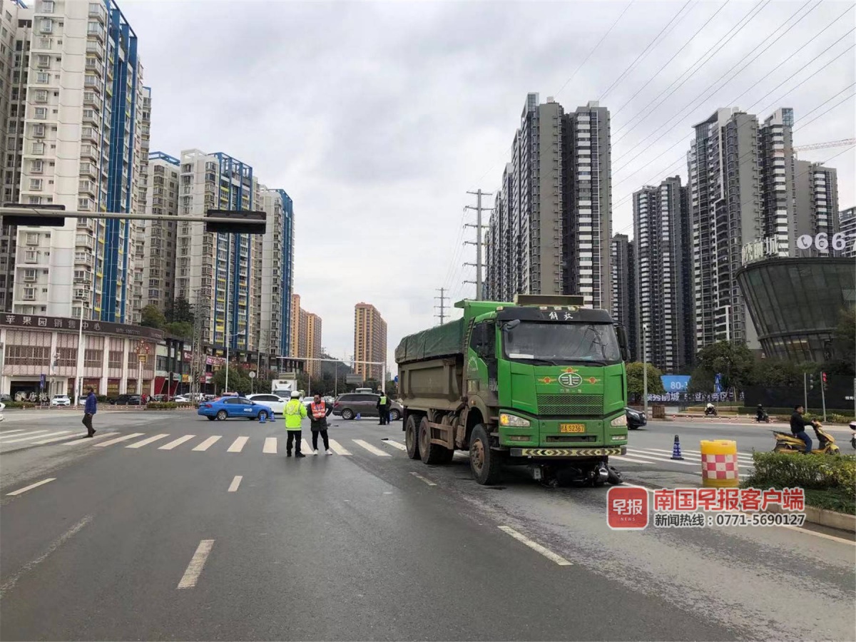 1月8日上午10时45分,在南宁市凤岭南路青环路口,一辆泥头车和一辆电动车发生碰撞后,电动车男骑手受伤倒地。事发后,南宁市交警支队机动大队民警、辅警正好开着警车巡逻经过,见此马上停车下来处置。