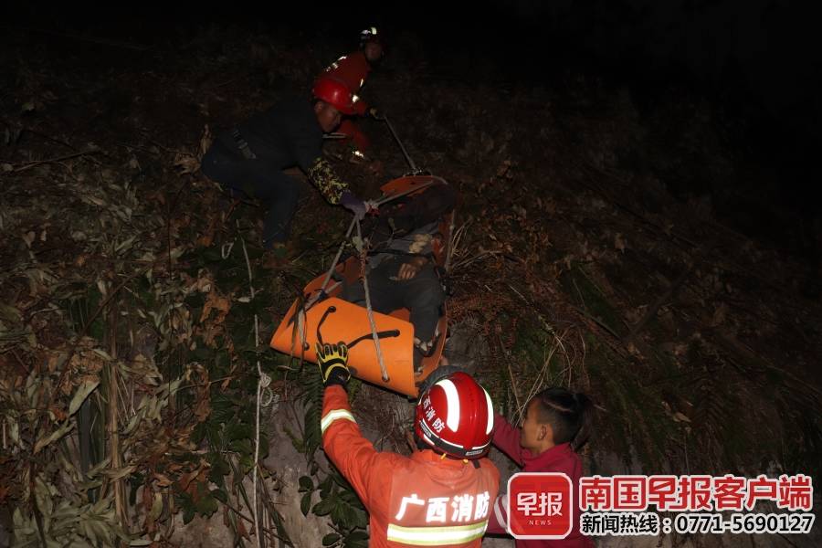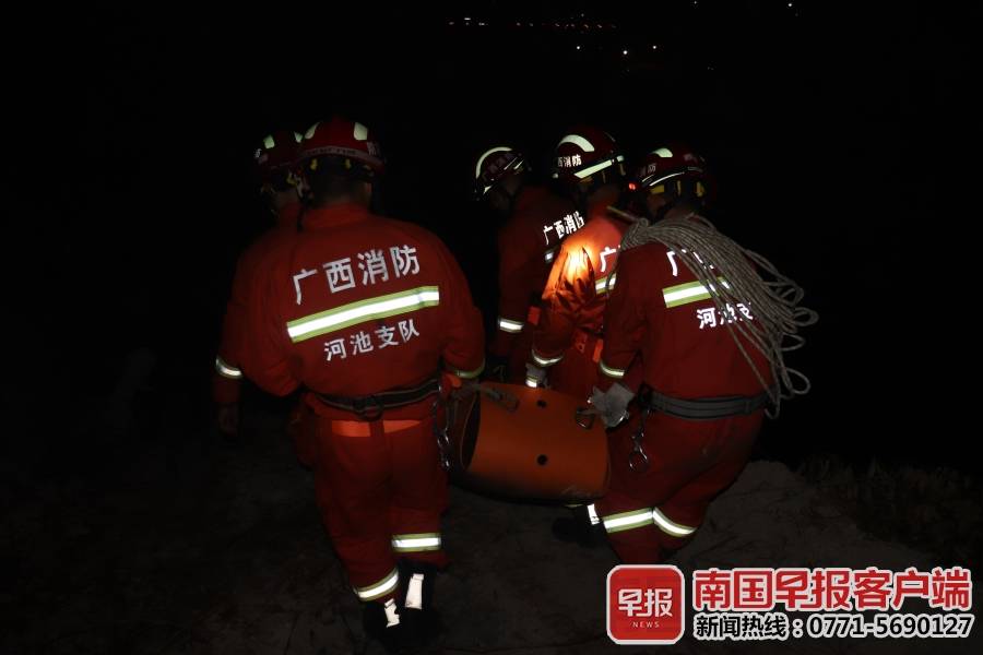 1月10日下午4时21分,河池市消防救援支队接到报警后,救援人员赶赴现场,发现三名群众被困在高约300多米的山顶上,其中一名被困人员在山顶作业时摔下约10米高的悬崖,其余两名被困者在山顶等待救援。