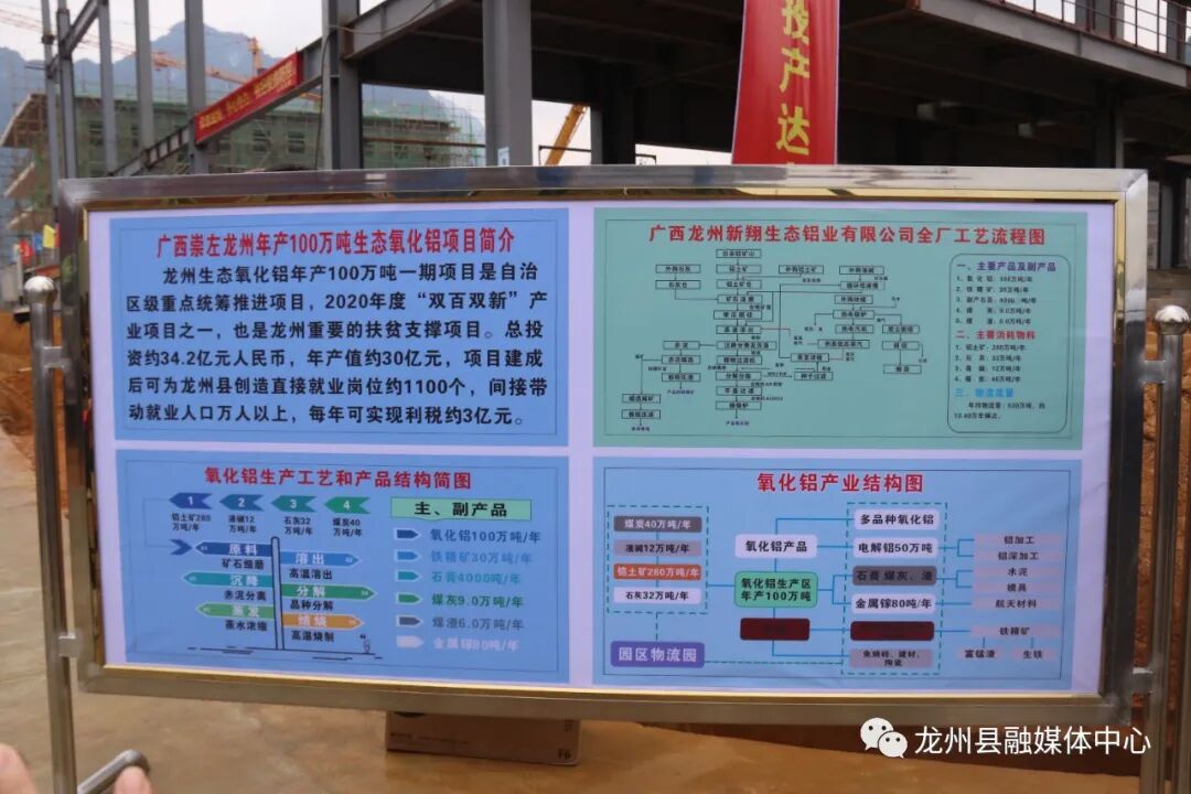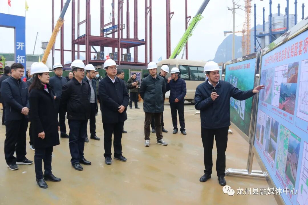 在生态氧化铝综合利用项目点,县委常委、常务副县长韦学平向考察组一行介绍了项目建设进展情况。据了解,龙州县生态氧化铝综合利用项目是2017年自治区级重大项目,项目规划设计年产200万吨氧化铝,其中一期产能100万吨/年,项目建设周期24个月,总投资34.2亿元。项目全面投产后,年产值约30亿元,创造就业岗位约1100个,可实现年利税3亿元左右。