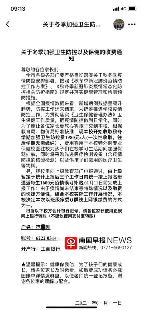 记者注意到,连日来,一份《关于冬季加强卫生防控以及保健的收费通知》在广西多个学校流传。该通知称,为统筹推进学校疫情防控工作,现本校开始收取秋冬学期加强卫生防控费1980元/人(一次性收取,往后学期无需缴纳),费用将用于本校特外聘专业保健校医驻校,为孩子们在校学习生活期间加强保驾护航,同时采购先进医疗检测设备以及供孩子们需用的医疗卫生等物料。