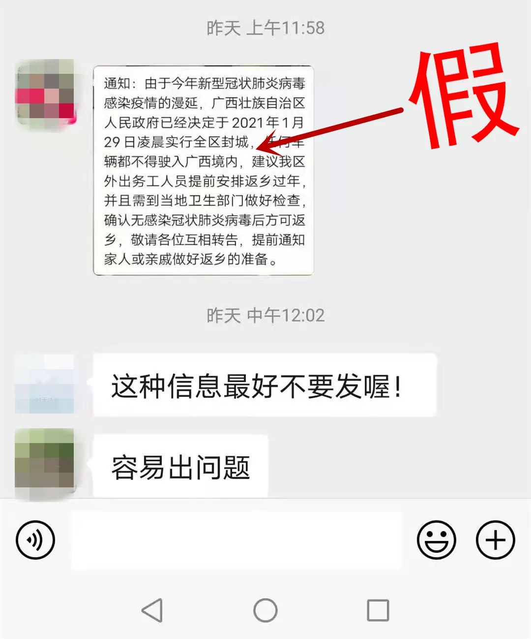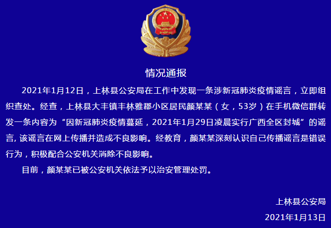 2021年1月12日,广西上林县公安局网安大队在日常网络巡查工作中发现,上林一网友于1月11日在某微信群中发布关于疫情的不实信息:“由于今年新型冠状病毒感染的肺炎疫情蔓延,广西壮族自治区人民政府已经决定于2021年1月29日凌晨实行全区封城,任何车辆都不得驶入广西境内…...”