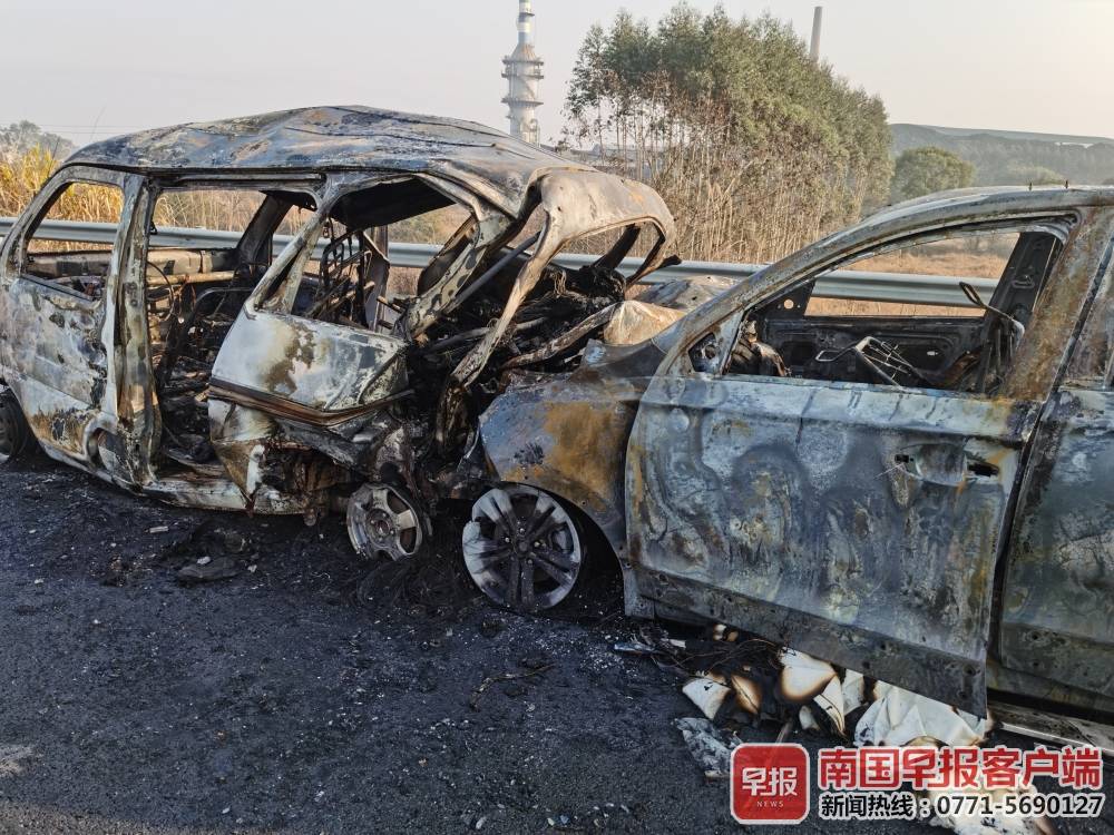 ▲事故现场起火的车辆被烧得面目全非。莫新建/摄