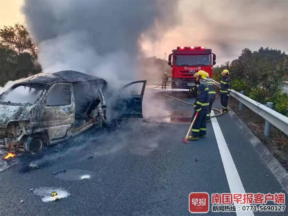 ▲面包车被撞出二三十米远后,两车起火燃烧。莫新建/摄