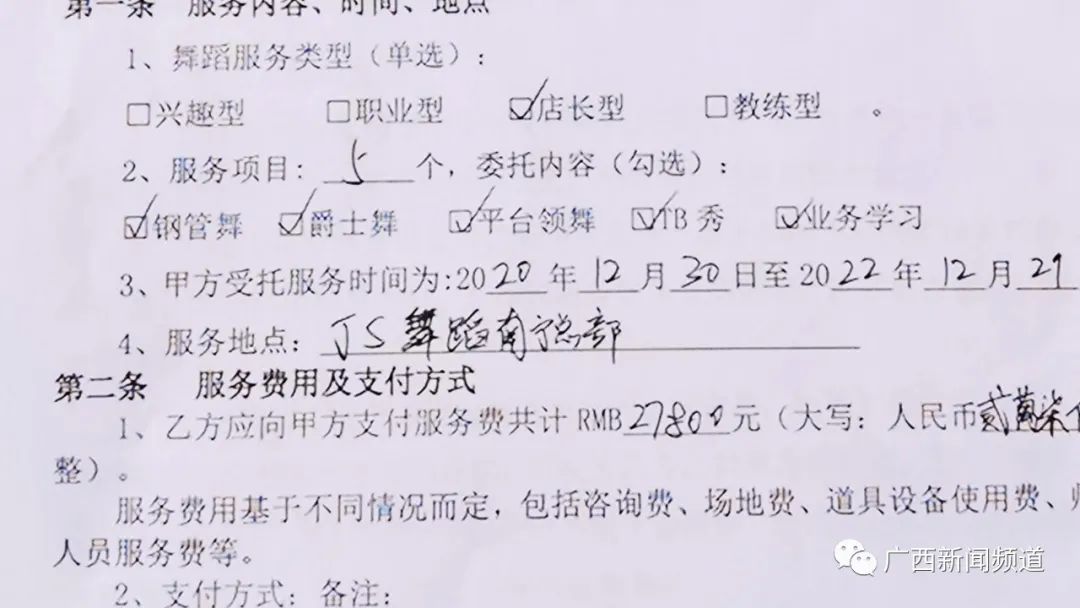 当时,国际JS舞蹈南宁总部一位姓熊的店长表示,想要得到这份工作首先要接受3到5个月的培训,培训费用是1万元,另外还需交考教练证和进修费用17800元。如果舞蹈学徒在培训期内,协助教练按照教学计划要求完成教学任务,这些费用就由国际JS舞蹈南宁总部来承担。在签完合同后,熊店长叫来了2名陌生男子。