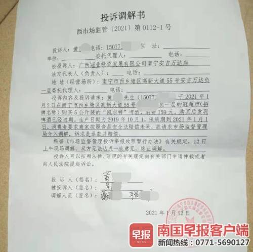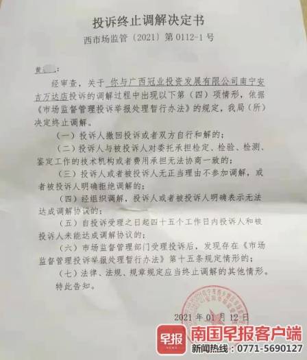 1月12日,南宁市西乡塘区市场监督管理局安阳市场监督管理所接到黄先生的投诉。监管所工作人员组织双方进行现场调解,但双方无法达成一致意见,终止调解。