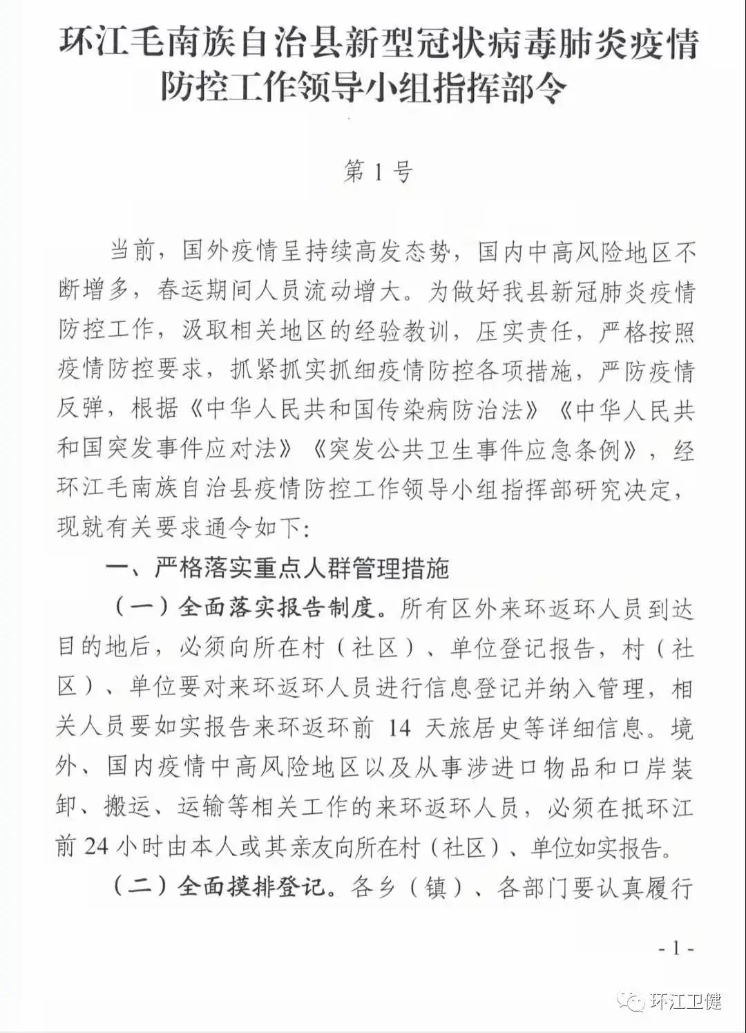 环江毛南族自治县新型冠状病毒感染的肺炎疫情防控工作领导小组指挥部第1号令