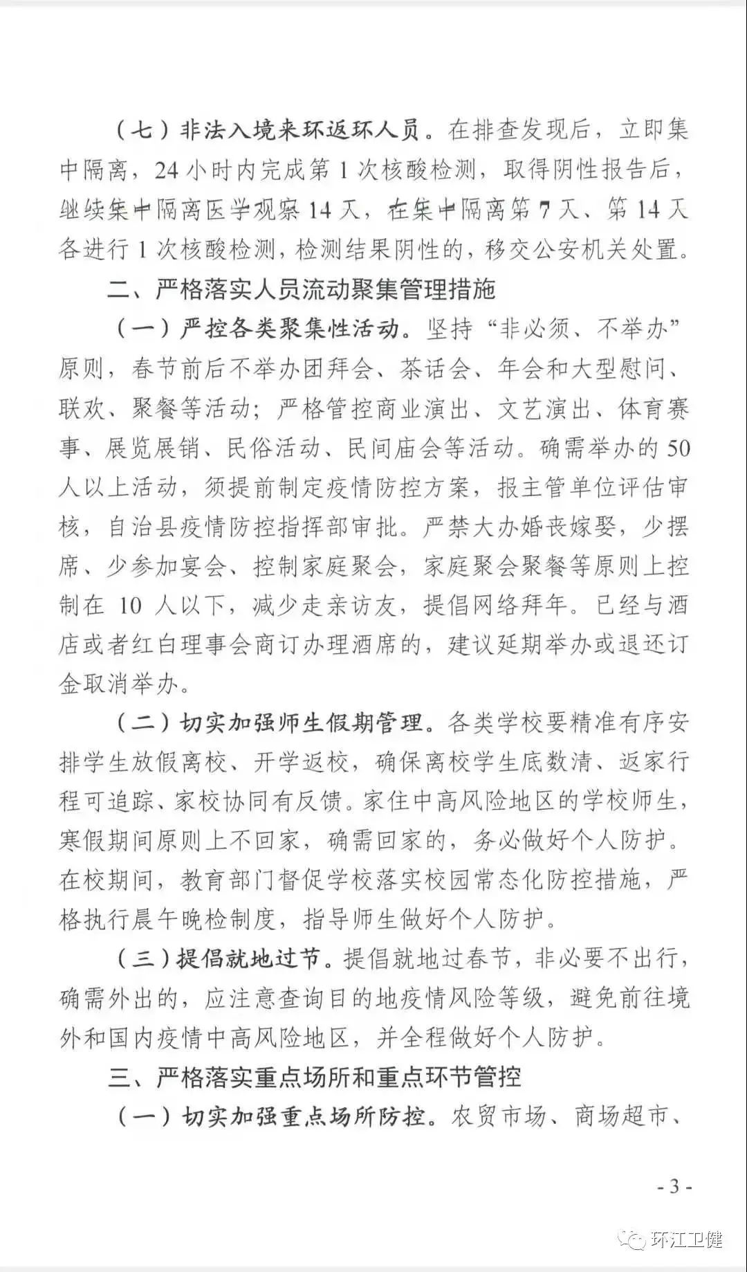 三、严格控制活动聚会。取消机关企事业单位团拜会、年会和大型慰问、联欢等活动。严禁大办婚丧嫁娶,婚事缓办、丧事简办、宴请不办。不串门、少走动,不扎堆、不搞联欢、不搞游园。严格控制家庭聚会,尽量不举办或参加聚会聚餐活动。减少流动以及聚集,不举办大型活动,不参加文艺演出、体育比赛、展览展销等大型活动。在玉的外来人员和本地市民群众非必要不离开玉林,尽量就地过年,减少走亲访友,提倡网络拜年,减少流动过程感染的风险。