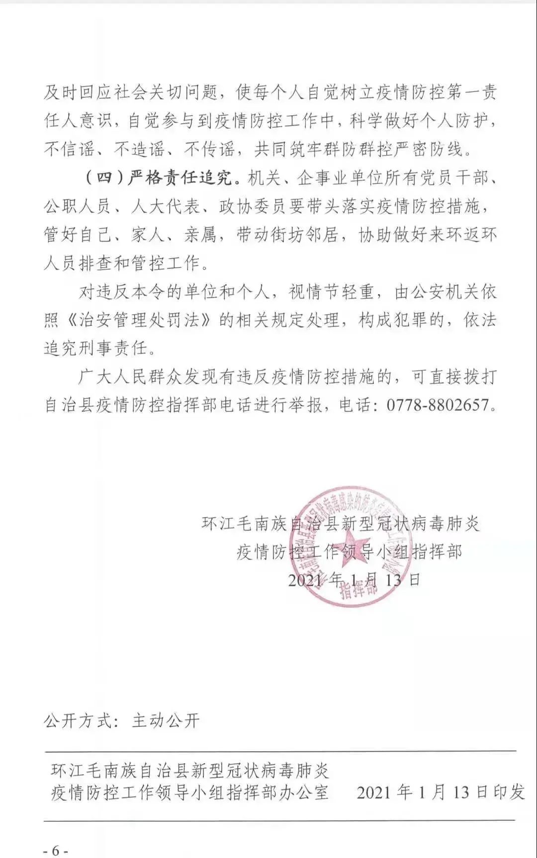 八、强化问责严肃责任追究。全体党员、领导干部,各级党代表、人大代表、政协委员要发挥带头作用,务必要管好家人、亲属,带动街坊邻居,协助做好“来宾返宾”人员排查和监督工作。广大人民群众发现有违反疫情防控措施的,可拨打0771-8236289进行举报,对违反疫情防控政策和措施的单位和人员,一律严肃追究相关责任。