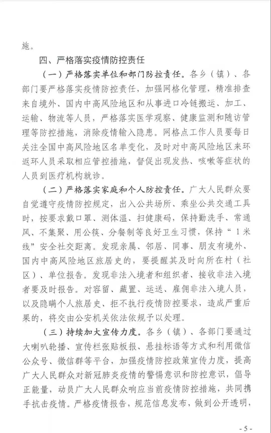 四、严格执行出行防控措施。所有单位、公共场所要安排人员在入口处开展测量体温、查验健康码、绿码通行等工作,并严格执行消毒措施。个人要配合管理,出入落实佩戴口罩和保持1米线等防控措施。全县各高速公路入口和重要交通卡口安排执勤人员对“来宾返宾”车辆司乘人员进行信息登记、体温监测等服务管理工作。